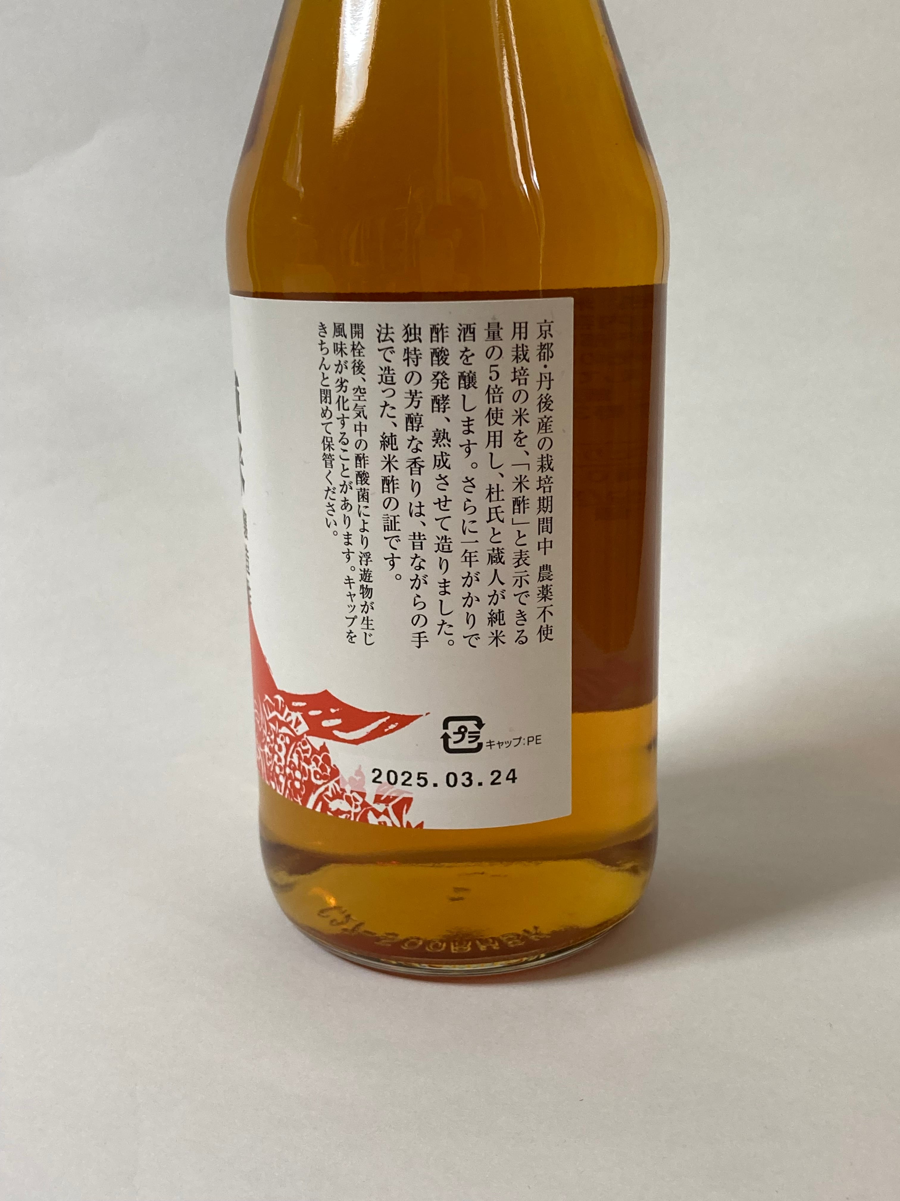 ☆京都・丹後産の栽培期間中 農薬不使用栽培の米を、「米酢」と表示できる量の5倍使用し純米酒を醸し、さらに一年がかりで酢酸発酵、熟成させて造りました。